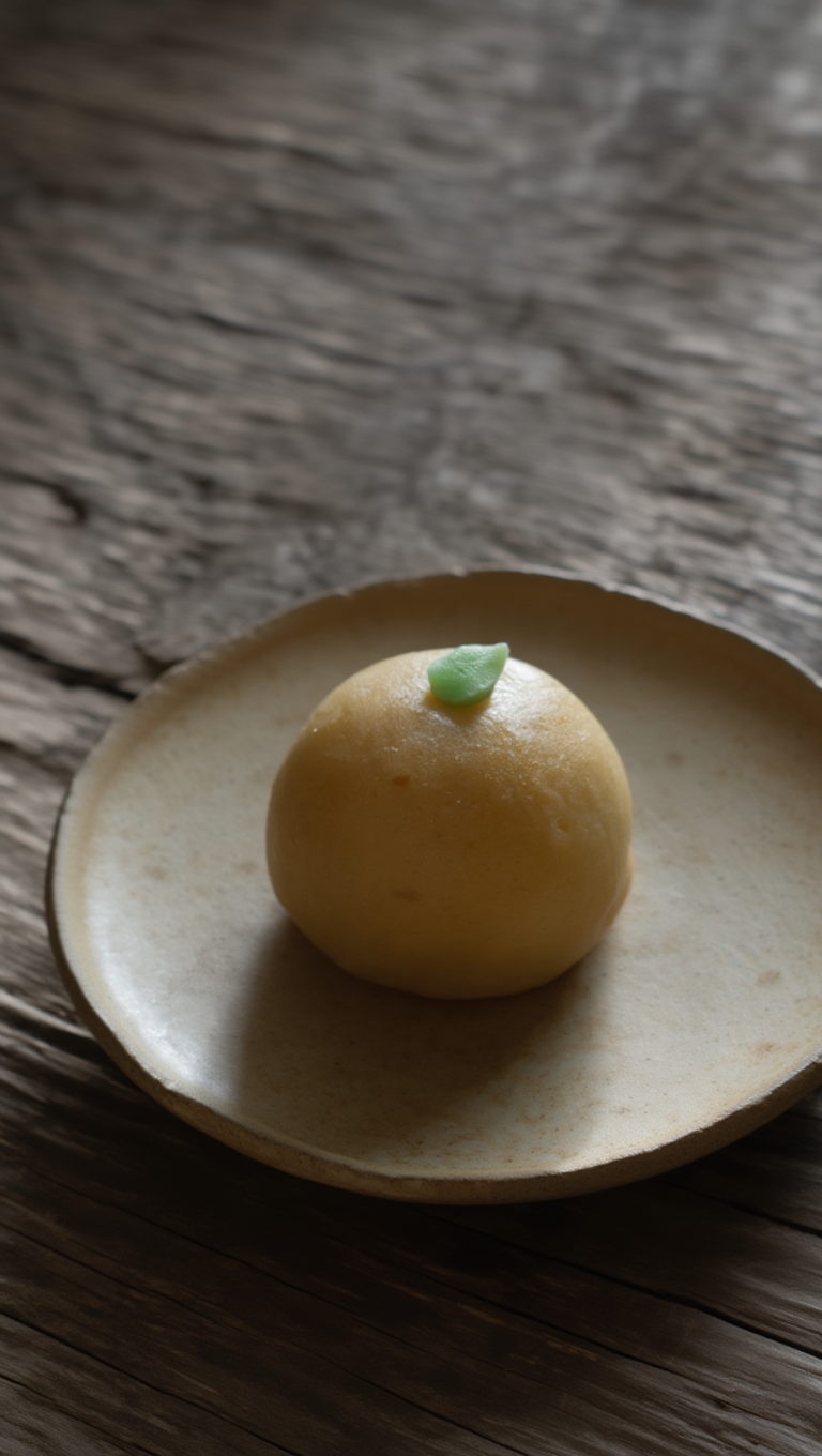 Winter citrus in a warm, tender bun. Soft steamed manju scented with yuzu wraps a smooth white-bean centre—clean, rounded, and quietly aromatic for tea.