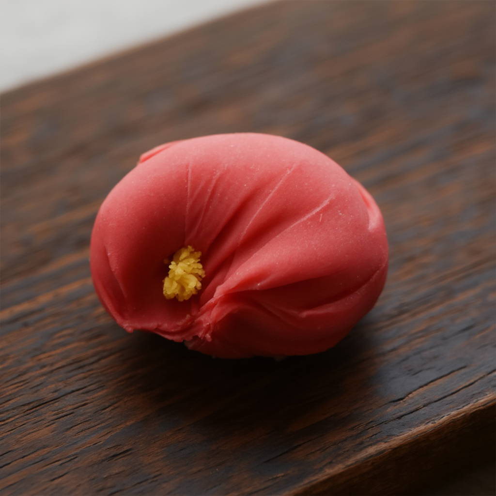 In the stillness of winter, the first colour is plum—tight buds holding warmth against the cold. This nerikiri captures that moment as a wrapped blossom with a quiet yellow heart and a calm soft red.
