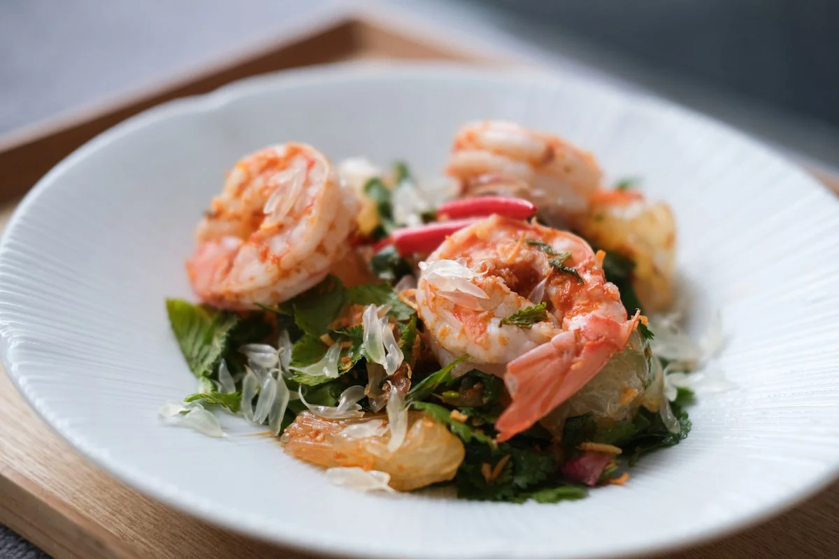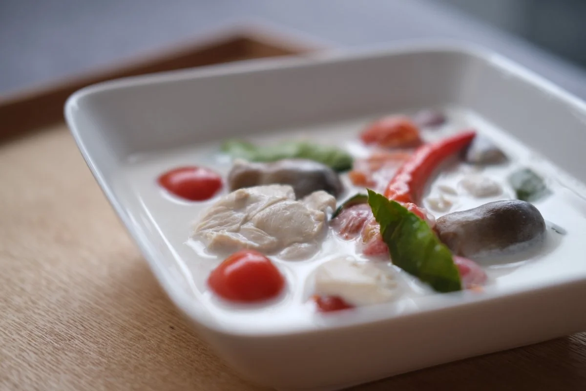 A balanced Thai trio highlighting warmth, freshness, and comfort. Tom Khaa Kai is a coconut–galangal chicken soup with gentle heat, citrus lift, and a silky finish. The prawn and pomelo salad is bright and juicy with herbs, crunch, and a clean, zesty dressing. Black sticky rice with taro closes the meal with a nutty, softly sweet pudding-style dessert—simple, satisfying, and fragrant.