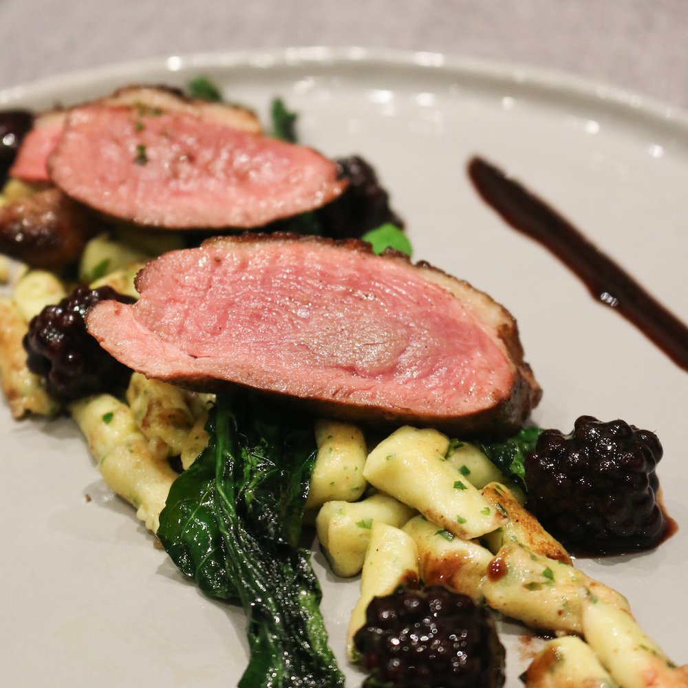 Cooking duck breast requires correct doneness, awareness of the fat content and utilizing it in crisping up the skin. Pair with this French classic poultry a summer berry sauce and a variation of quick gnocchi, everything made from scratch, then finish your meal with a delightful sabayon dessert.