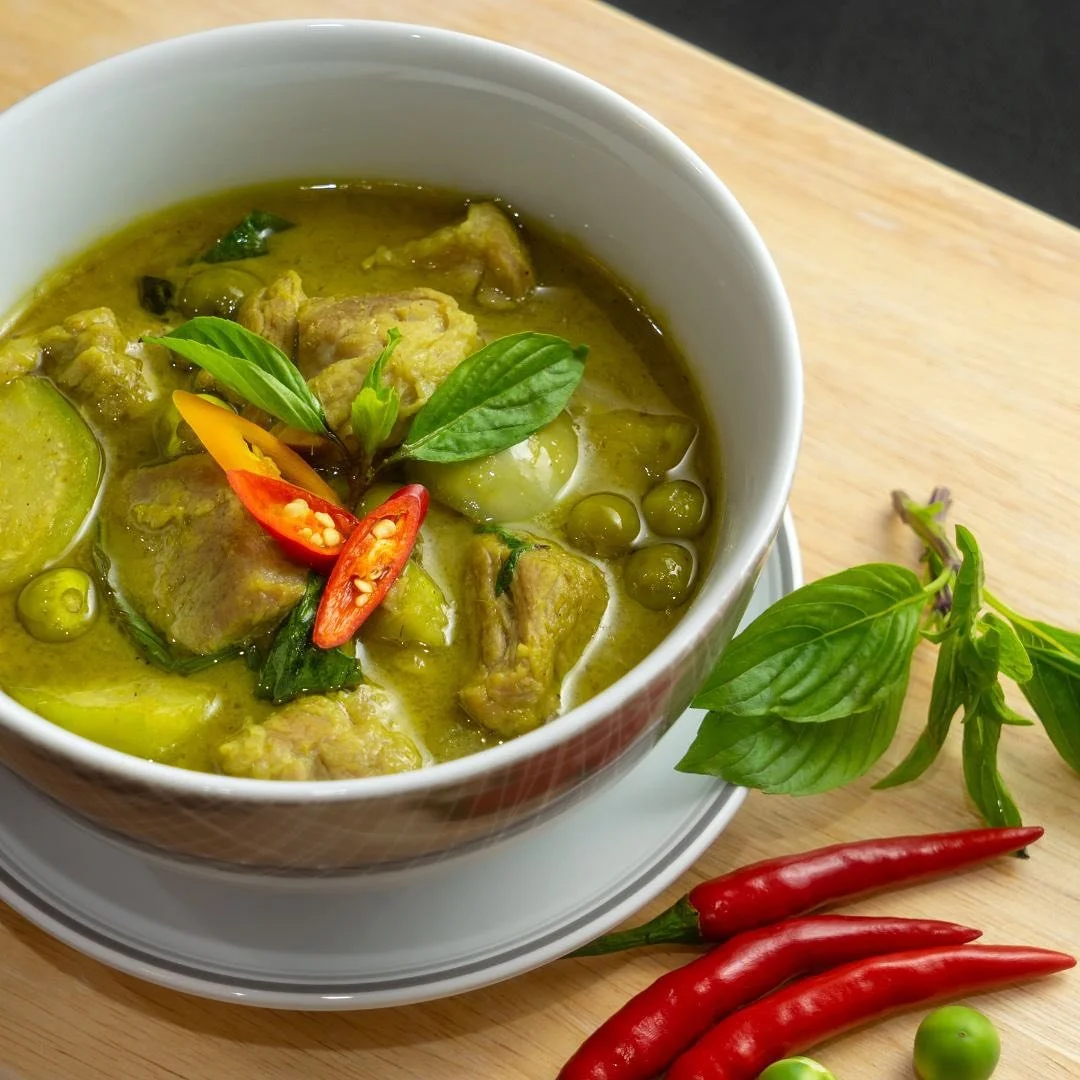A warm-and-bright Northern Thai pairing. Khao Soi features a fragrant coconut curry broth with tender noodles and a crisp noodle garnish, finished with fresh lime and pickled accents for balance. Yam Plaa brings a light, crunchy fish salad with herbs and a clean, zesty dressing. Together, the bowl and salad contrast richness and freshness for a complete, satisfying plate.