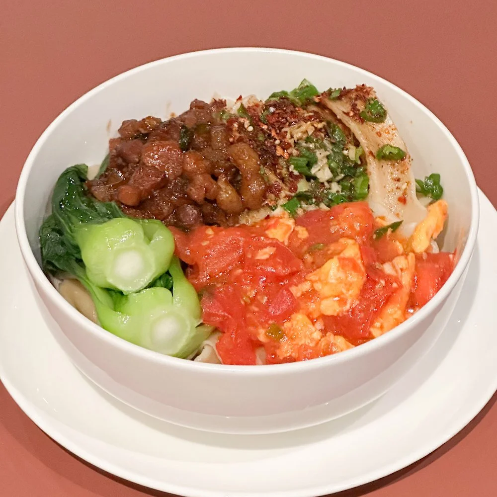 Hand-pulled Noodles Topped with Tomato and Egg, Oil Poached Chilli, Meat Sauce